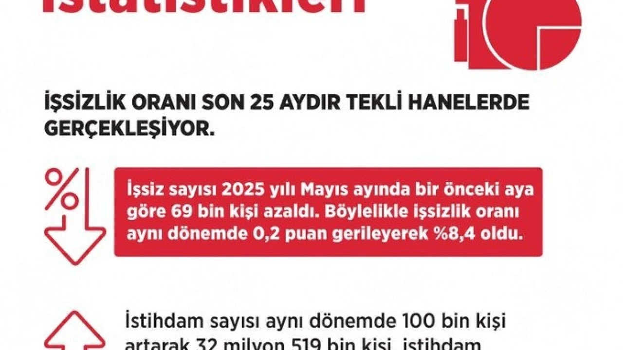 Çalışma ve Sosyal Güvenlik Bakanı Vedat Işıkhan, Türkiye İstatistik Kurumu’nun (TÜİK) mayıs ayı dış ticaret ve işgücü istatistikleri ile hizmet üretici fiyat endeksini açıklamasının ardından sosyal medya hesabından açıklamada bulundu. Yatırım, istihdam, üretim ve ihracat odaklı büyüme stratejilerinin işgücü verilerinde olumlu seyri devam ettirdiğini belirten Işıkhan, "Son 25 aydır tekli hanelerde gerçekleşen işsizlik oranı, bu yılın mayıs ayında bir önceki aya göre 0,2 puan azalarak yüzde 8,4 seviyesinde gerçekleşti. 69 bin kişi azalan işsiz sayısı, 2 milyon 972 bin kişiye geriledi. Genç nüfusta da azalan işsizlik oranı, aynı dönemde 0,3 puan gerileyerek yüzde 15,4 oldu" ifadelerine yer verdi.