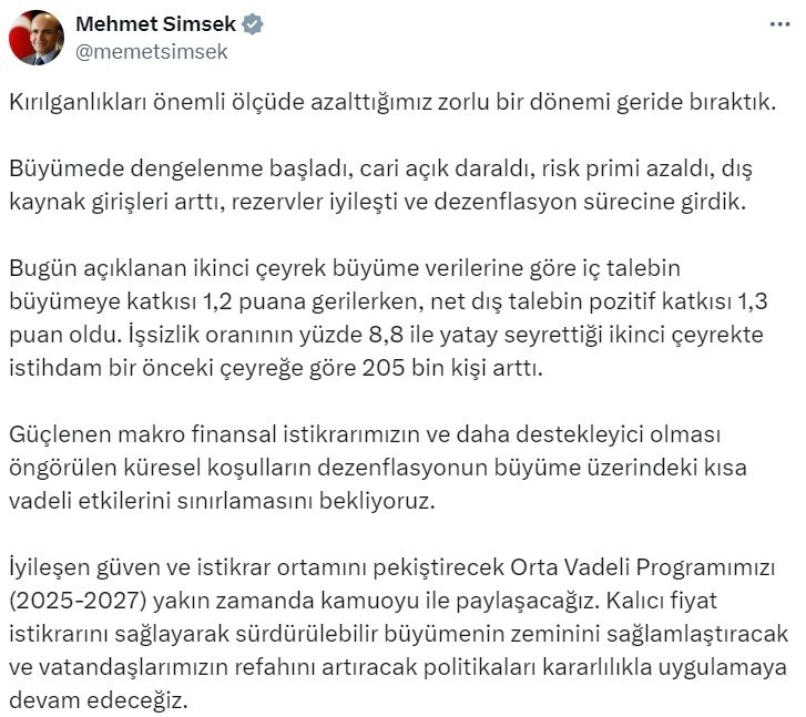 Bakan Şimşek, ekonomik gidişata ilişkin açıklamalarda bulundu. Kırılganlıkların önemli ölçüde azaltıldığı zorlu bir dönemin geride bırakıldığını belirten Bakan Şimşek, "Büyümede dengelenme başladı, cari açık daraldı, risk primi azaldı, dış kaynak girişleri arttı, rezervler iyileşti ve dezenflasyon sürecine girdik. Bugün açıklanan ikinci çeyrek büyüme verilerine göre iç talebin büyümeye katkısı 1,2 puana gerilerken, net dış talebin pozitif katkısı 1,3 puan oldu. İşsizlik oranının yüzde 8,8 ile yatay seyrettiği ikinci çeyrekte istihdam bir önceki çeyreğe göre 205 bin kişi arttı. Güçlenen makro finansal istikrarımızın ve daha destekleyici olması öngörülen küresel şartların dezenflasyonun büyüme üzerindeki kısa vadeli etkilerini sınırlamasını bekliyoruz. İyileşen güven ve istikrar ortamını pekiştirecek Orta Vadeli Programımızı (2025-2027) yakın zamanda kamuoyu ile paylaşacağız. Kalıcı fiyat istikrarını sağlayarak sürdürülebilir büyümenin zeminini sağlamlaştıracak ve vatandaşlarımızın refahını artıracak politikaları kararlılıkla uygulamaya devam edeceğiz" ifadelerini kullandı.