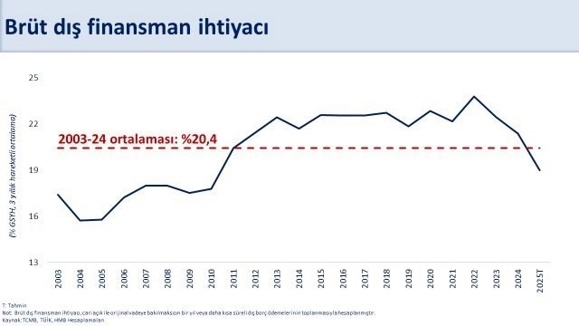 Cari açığın sürdürülebilir seviyelerde kalması, brüt dış finansman ihtiyacının milli gelire oranındaki düşüş eğiliminin süreceğine işaret ediyor.