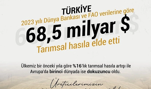 “Çiftçilerimizin alın teri, ülkemiz ekonomisine değer katmayı sürdürüyor. FAO ve Dünya Bankası verilerine göre, 2023 yılında elde edilen 68,5 milyar dolarlık tarımsal hasıla ile Türkiye, Avrupa'da birinci, dünyada ise ilk on ülke arasında yer aldı. Bu başarıda emeği geçen tüm sektör paydaşlarımızı gönülden kutluyorum.”