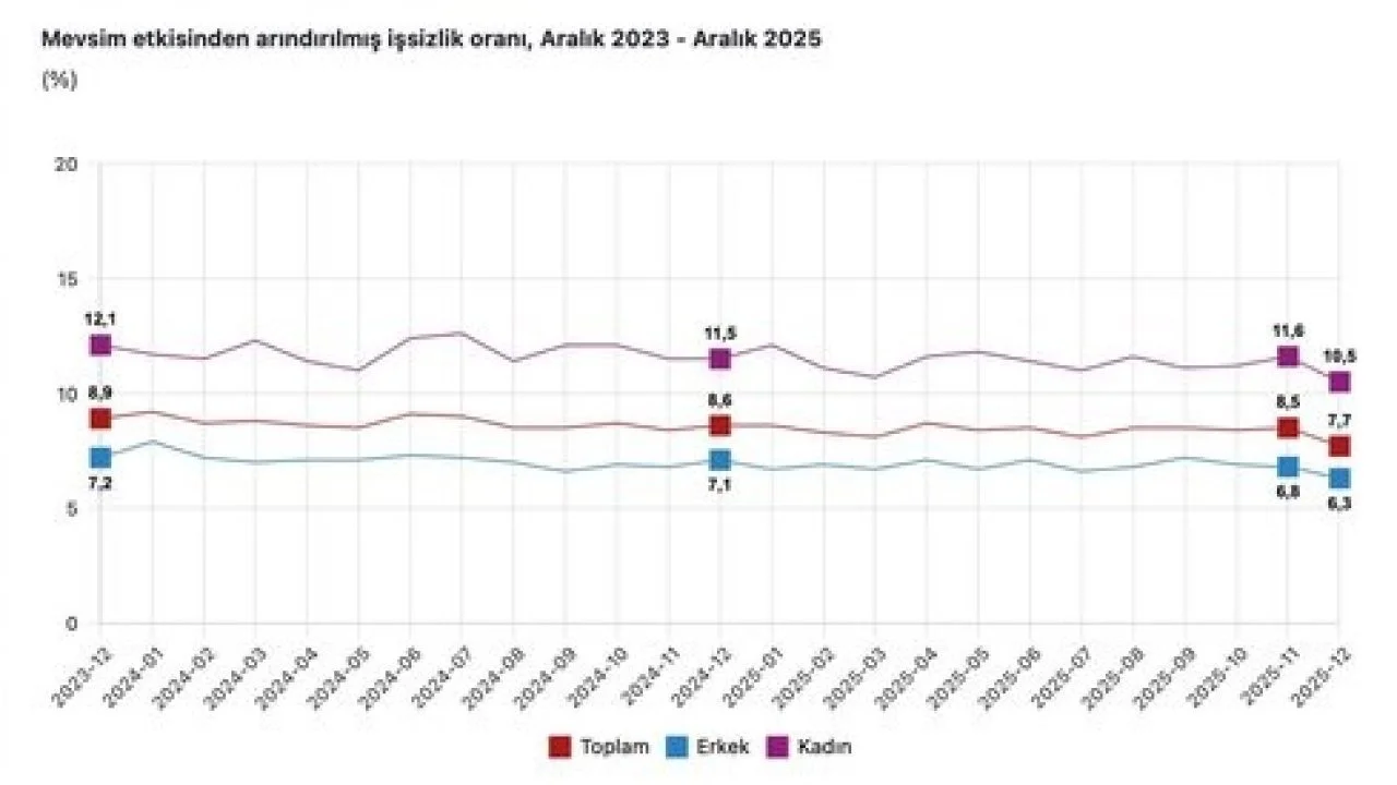 Aralık ayındaki verilere göre işsizlik oranının yüzde 7,7 olarak açıklandığını ifade eden Yılmaz, istihdam verilerinin, işgücü istatistik verilerinin açıklanmaya başlandığı 2005 yılından bu yana en düşük seviyeye indiğinin altını çizdi. Yılmaz ayrıca, işsizliğin gençlerde geçen senenin aynı ayına göre 1,9 puan, kadınlarda ise 1 puan iyileşerek sırasıyla yüzde 14,1 ve yüzde 10,5 olduğunu sözlerine ekledi.
