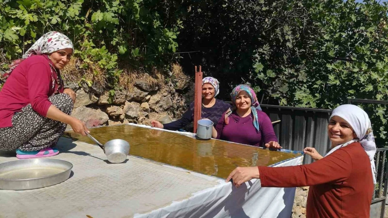 Dutun önemli geçim kaynağı olduğu Erzincan’ın Kemaliye ilçesinde kadınlar, zorlu pestil ve pekmez yapımını imece usulü gerçekleştiriyor.