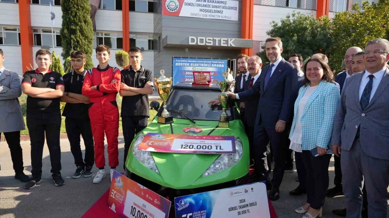 Bir dizi ziyaret kapsamında Denizli’ye gelen Enerji ve Tabii Kaynaklar Bakanı Alparslan Bayraktar, Denizli Organize Sanayi Bölgesi DOSTEK Koleji’ni ziyaret etti. Teknofest 2025’te 4 ana kategoride ödül alan öğrenciler, okula gelen Bakan Bayraktar’ı Ecogreen Enerji’nin destekleriyle ürettikleri elektrikli araç ile karşıladı. Enerji ve Tabii Kaynaklar Bakanı Bayraktar, burada gençlerden araç hakkında bilgi alarak bir süre sohbet etti, kolejin konferans salonunda sanayiciler, öğretmenler ve öğrenciler ile bir araya geldi.