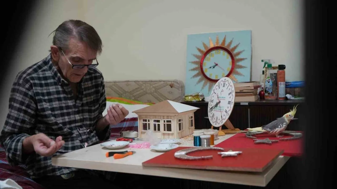 Bayburt Memnune Evsen Huzurevi Yaşlı Bakım ve Rehabilitasyon Merkezi sakinlerinden 74 yaşındaki Bülent Alemdar, pandemi döneminde tanıştığı el sanatlarıyla takı tasarımı, filografi ve maket alanında çalışmalar yapıyor. El emeği ürünler hazırlayan Alemdar, 6 yıldır üretmeyi sürdürüyor.