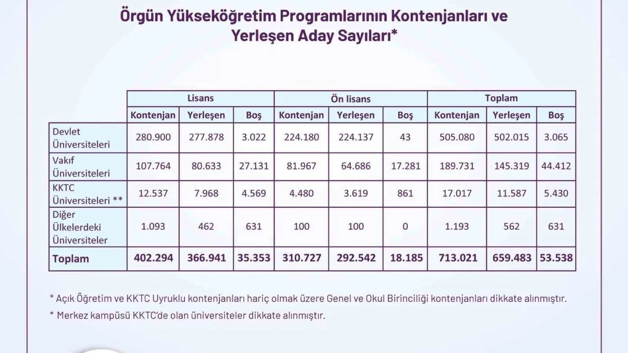 İlk yerleştirme verilerine göre, yurt içindeki devlet ve vakıf üniversitelerindeki örgün ön lisans ve lisans programlarına yerleşme hakkı kazanan aday sayısı 665 bin 54 olurken, toplam boş kontenjan sayısı 53 bin 338 olarak gerçekleşti. Devlet üniversitelerinde örgün yükseköğretim programlarına tahsis edilen toplam 521 bin 24 kontenjanın 515 bin 521’i dolarken, yüzde 99 gibi yüksek bir doluluk oranı ortaya çıktı. Vakıf yükseköğretim kurumlarındaki genel kontenjanların doluluk oranı ise yüzde 75,8 oldu.