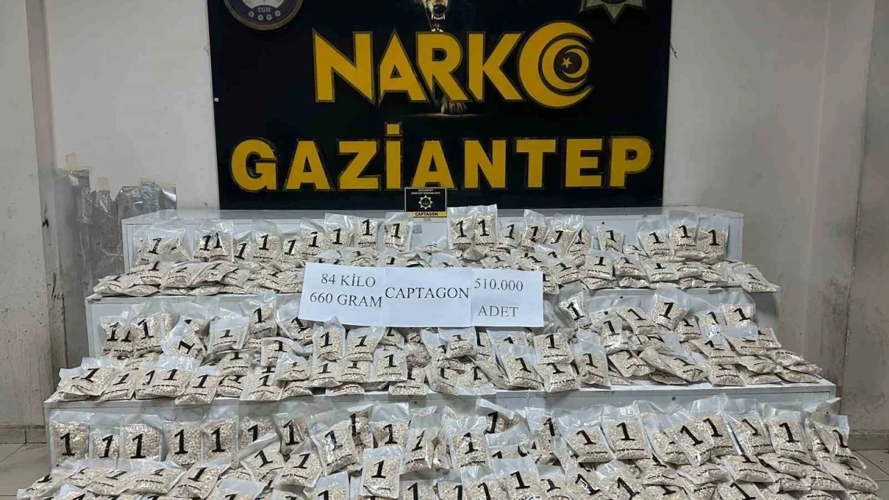 Gaziantep Emniyet Müdürlüğü Narkotik Suçlarla Mücadele Şube Müdürlüğü ekipleri ve Cumhuriyet Başsavcılığı koordinesinde narkotik operasyonu yapıldı. Operasyon çerçevesinde, kent çıkışında yapılan yol kontrolünde şüpheli bir araç durduruldu. Araçta, hassas burunlu dedektör köpek destekli aramalarda çuvallara zulalanmış halde 510 bin adet uyuşturucu captagon hap ele geçirildi. Olayla ilgili 1 şüpheli şahıs gözaltına alındı.