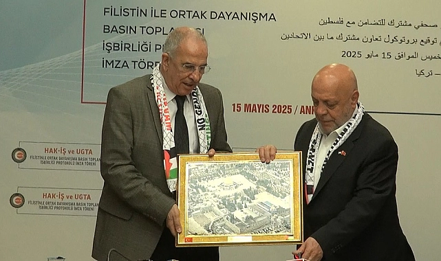 "Bugün UGTA başkanıyla imzalayacağımız Filistin deklarasyonunda bunun daha geniş bir şekilde ifadesini bulacaksınız. Biz konfederasyonumuz HAK-İŞ olarak sesimiz çıktığı sürece nefesimiz yettiği müddetçe bu katliamlara karşı bu gerçekten insanlığın gözü önünde yapılan soykırıma karşı sonuna kadar devam ettireceğiz. Mücadelemizi engellemek isteyenlere karşı daha da güçlü ses vermeye devam edeceğiz. UGTA'yla birlikte ülkemize gelip ikili işbirliği anlaşmalarıyla Filistin Deklarasyonu'nu imzalayan ülke sendikalarına da ayrıca teşekkür ediyorum. Güney Afrika'dan Balkanlar'a Arnavutluk'a kadar pek çok ülkedeki sendikacı kardeşlerimizle ortak deklarasyonları yayınlayarak daha sonra da bunu inşallah bir bütün olarak ülkemizde daha geniş bir ortak çalışmayı da HAK-İŞ olarak gerçekleştirme umuduyla bugün bu toplantımızla Filistin'e desteğimizi bir kez daha ifade etmek imkanımız oldu."