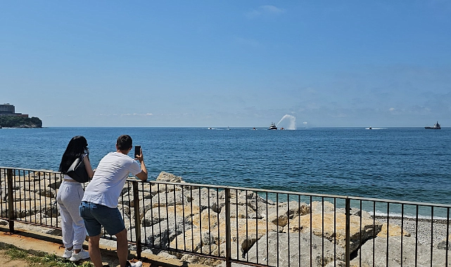 Vatandaşlar da denizdeki gösterileri karadan izleyerek fotoğraf çekti. Limanda demirli bulunan yük gemisi korna çalarak kutlamalara katıldı.