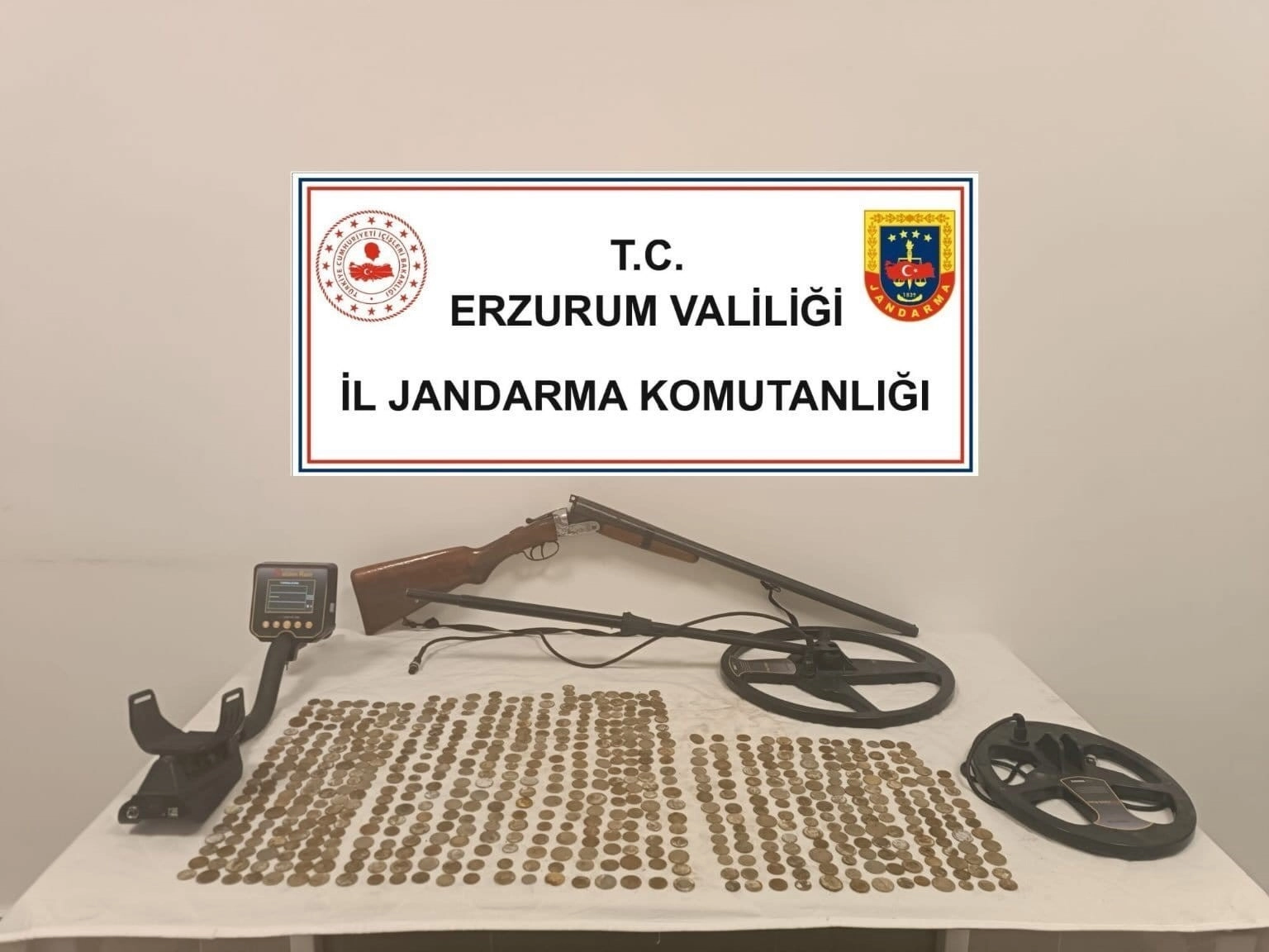 Erzurum İl Jandarma Komutanlığı ve Tekman İlçe Jandarma Komutanlığınca Tekman ilçesinde yapılan operasyonlarda 615 adet tarihi sikke, 1 adet dedektör ve 1 adet ruhsatsız av tüfeği ele geçirildi.