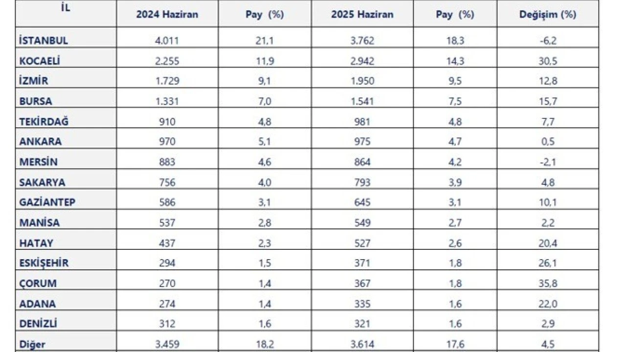 Haziran ayında geçen yılın aynı ayına göre faaliyet illeri bazında ihracatta en fazla artış incelendiğinde ise Kocaeli 687 milyon dolarlık artışla birinci, İzmir 221 milyon dolarlık artışla ikinci, Bursa 209 milyon dolarlık artışla üçüncü, Çorum 97 milyon dolarlık artışla dördüncü, Hatay ise 89 milyon dolarlık artışla beşinci sırada yer aldı.